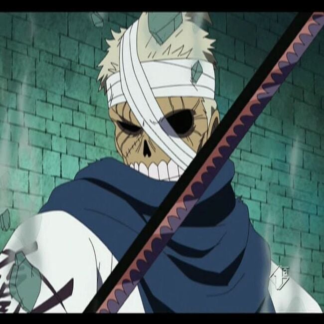 This is a picture of Ryuma, a fictional character, the legendary swordsman of Wano with the title "Sword God" in the manga One Piece. Ryuma has several bandages that partially cover his skull face, has no eyes and no nose, and wears a samurai gi with intricate and detailed designs.